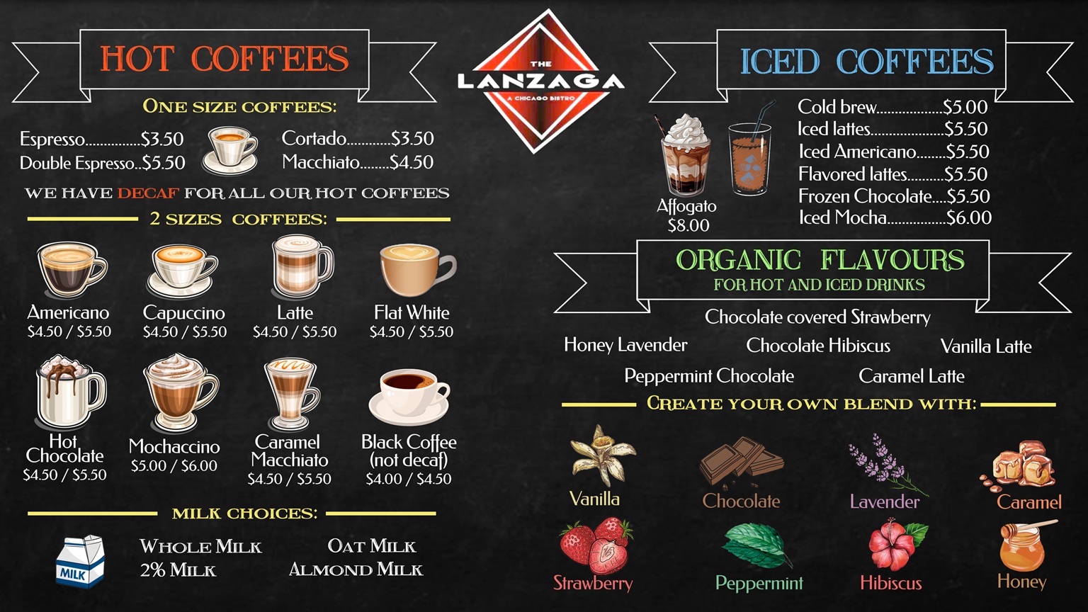 Discover Lanzaga Bistro’s selection of hot and iced coffees, including espresso, lattes, cappuccinos, and organic flavors. Choose from a variety of milk options to customize your drink