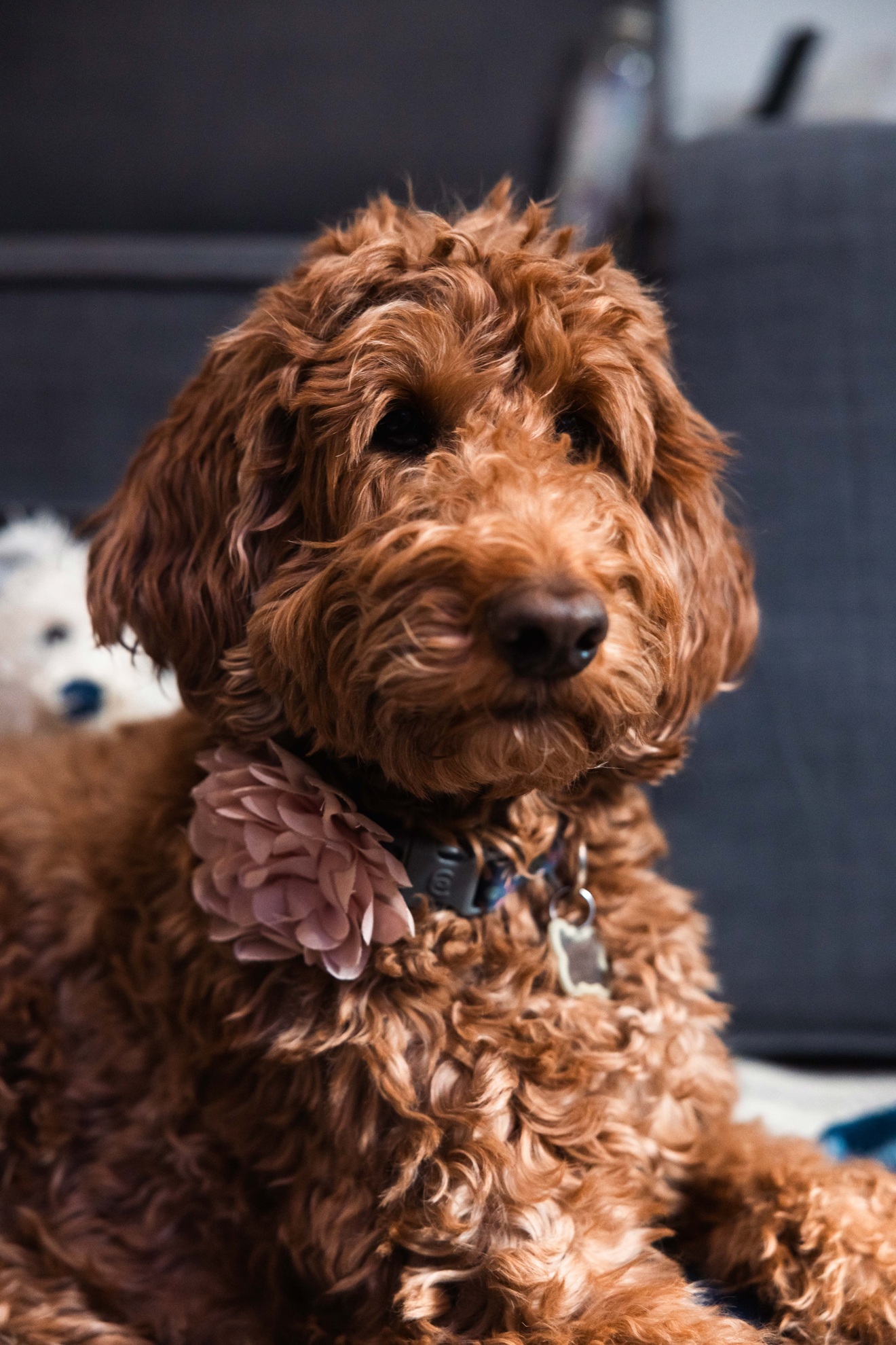Portrait of Ruby, a senior Goldendoodle, with a gentle expression and pink flower collar. This image was taken during a pet photography session for a pet photography blog