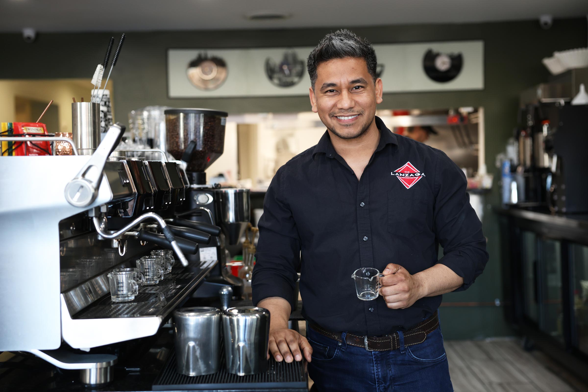 This inviting photograph showcases a friendly barista, the heart of a bustling coffee shop. His warm smile and confident posture convey a passion for his craft. The focus is on him holding a freshly pulled shot of espresso, with the professional coffee machine and steaming pitchers in the foreground, emphasizing the tools of his trade. The soft lighting and background details create a cozy and authentic coffee shop scene