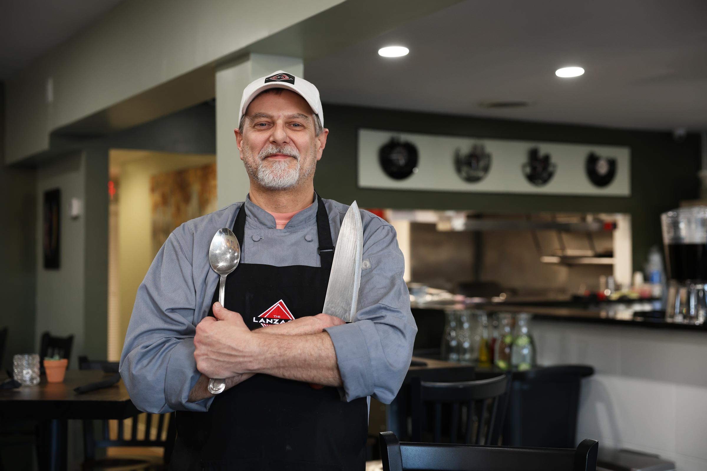 This portrait captures a chef in his element, ready to bring his culinary vision to life. His confident smile and the crossed spoon and knife suggest both precision and passion for his craft. The restaurant background, with tables and a partially visible kitchen, sets the scene for his creative work. This image embodies the artistry and skill behind fine dining.