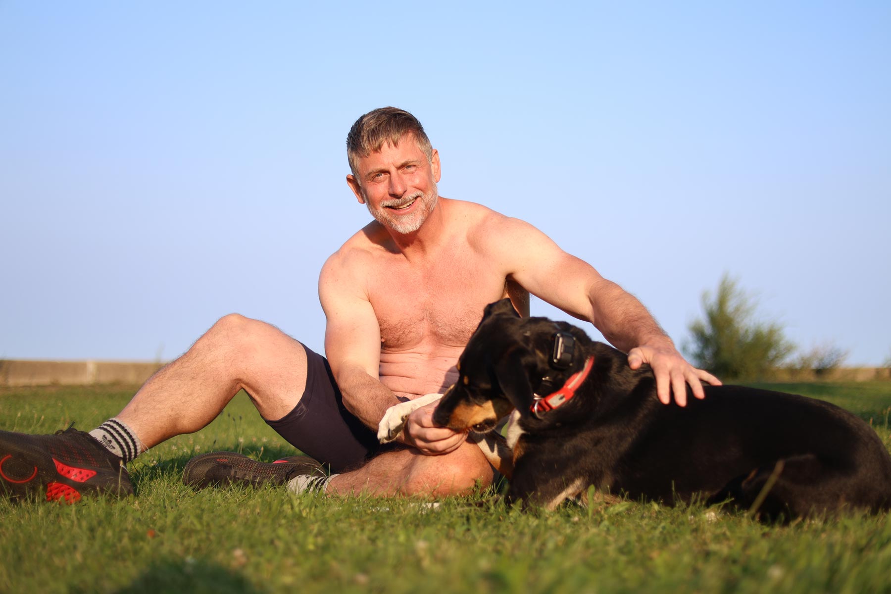 Casual Mid-50s Man Photoshoot with Dog A shirtless man in his mid-50s with a beard, casually kneeling next to his dog in a park Escribe un comentario Cancel reply Δ
