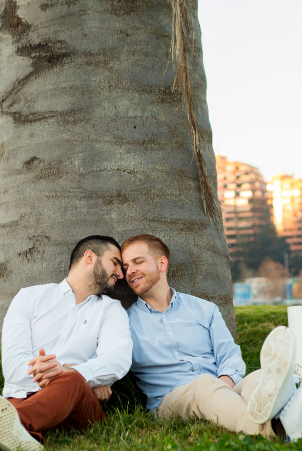 Tender Moment – Same-Sex Engagement Two men sitting and leaning affectionately against a large palm tree during their engagement photoshoot in an urban setting Escribe un comentario Cancel reply Δ