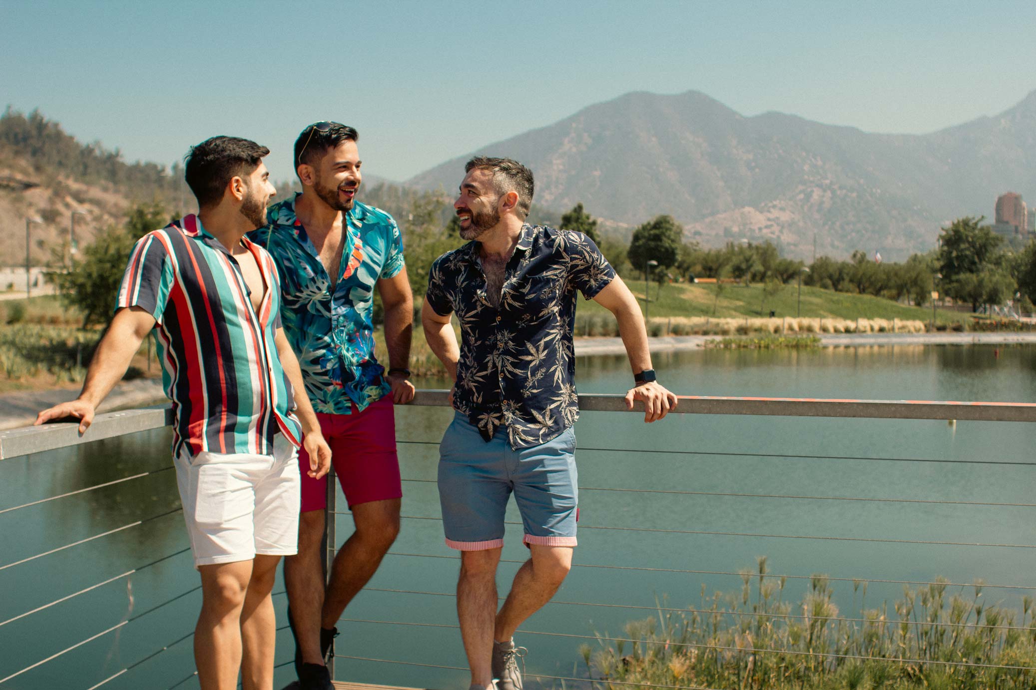 Three men standing on a viewing platform, enjoying the scenery of a lake and mountains, during a photoshoot celebrating their relationship.