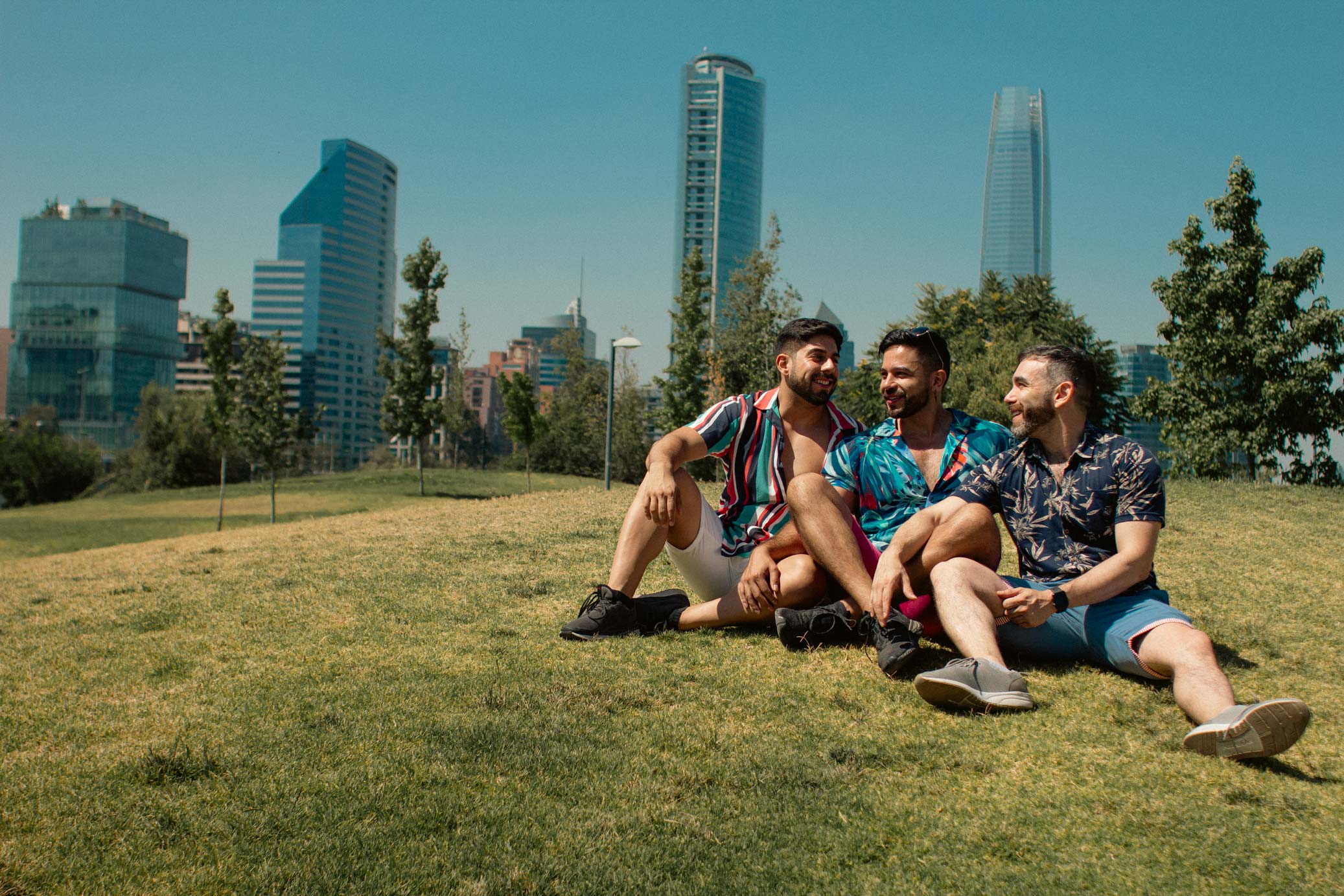 Three men sitting together on a grassy hill in a city park, enjoying a sunny day during a photoshoot celebrating their relationship