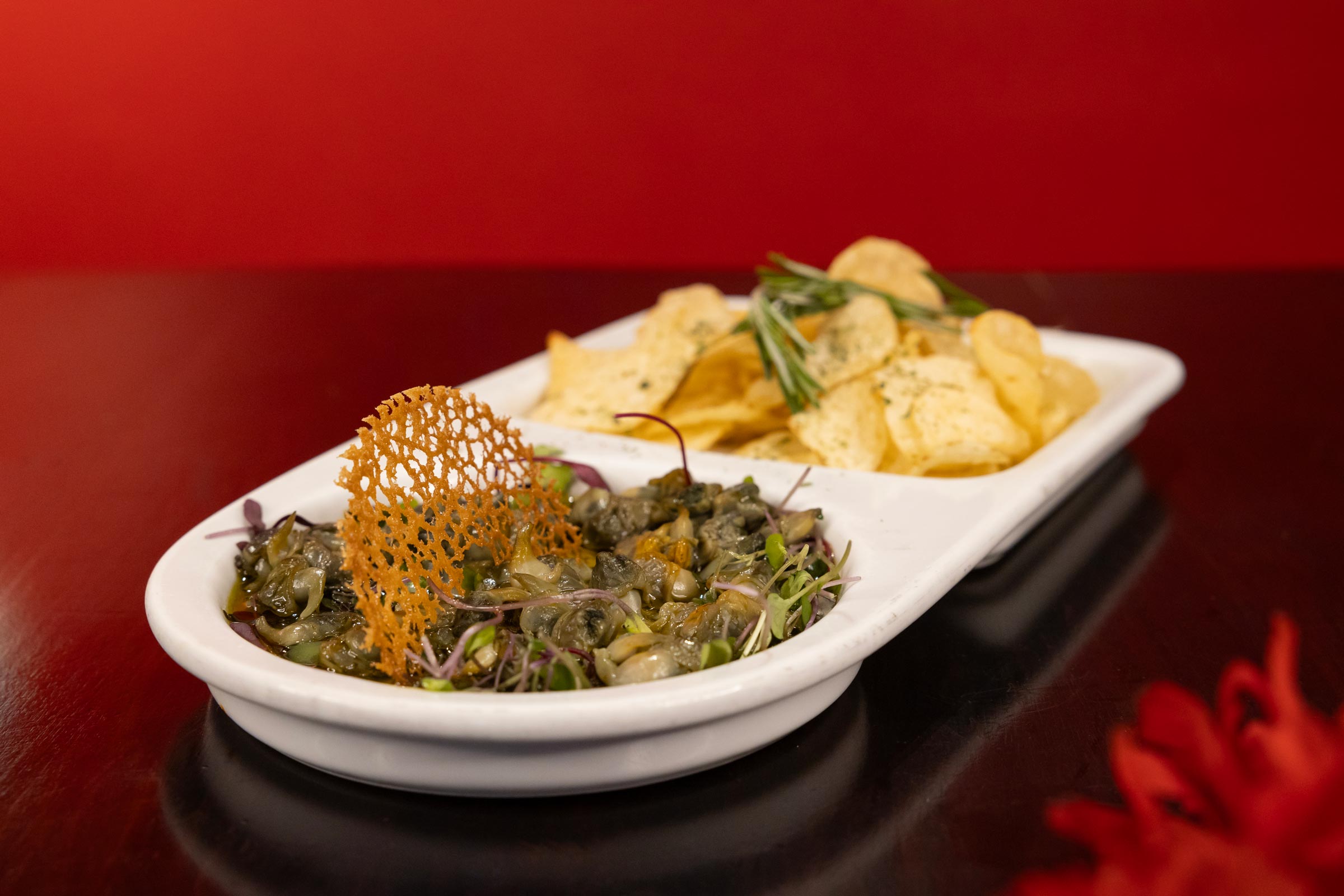 An adventurous and delicious tapa of Spanish snails “caracoles,” prepared in a savory sauce and served with a side of crunchy potato chips. A true delicacy from our menu.
